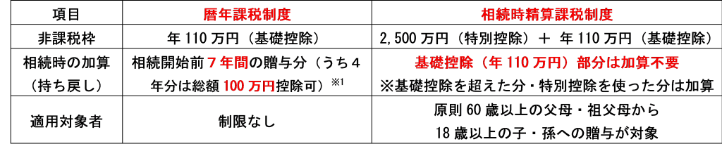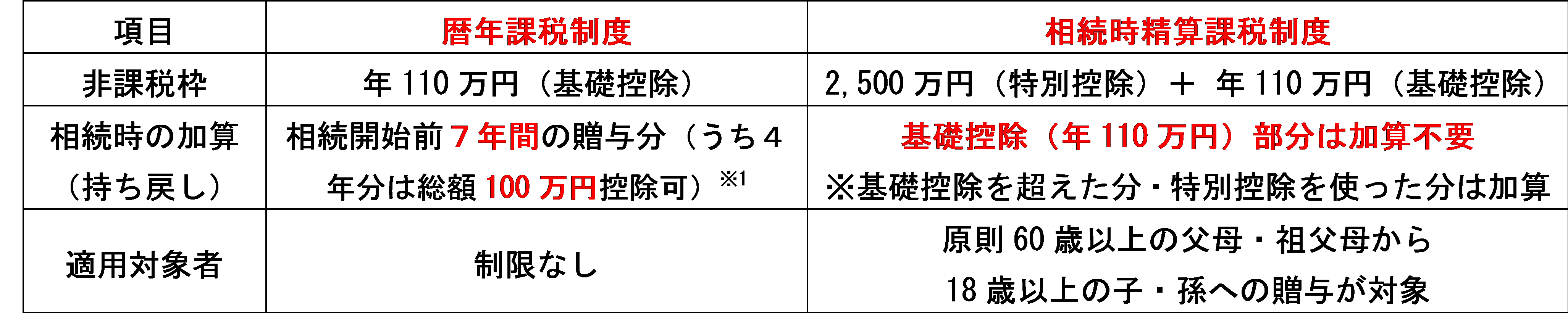 生前贈与には「暦年課税」と「相続時精算課税」の2つの制度があり、改正によりそれぞれのメリット・デメリットが変化しました。改正後の概要を比較すると以下の通りです。